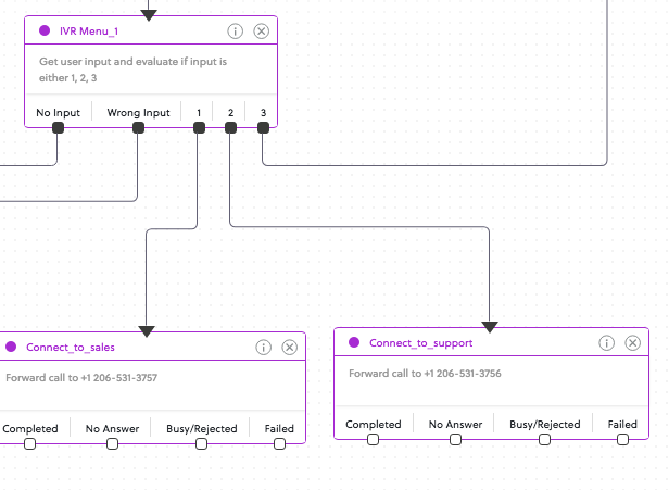I entered the text that explains to callers key to press to reach our sales team and which for support. Alternately, you can upload an MP3 file that does the same thing. I connected the IVR menu choices to the next logical action — I dragged Call Forward components to the canvas and connected to them.